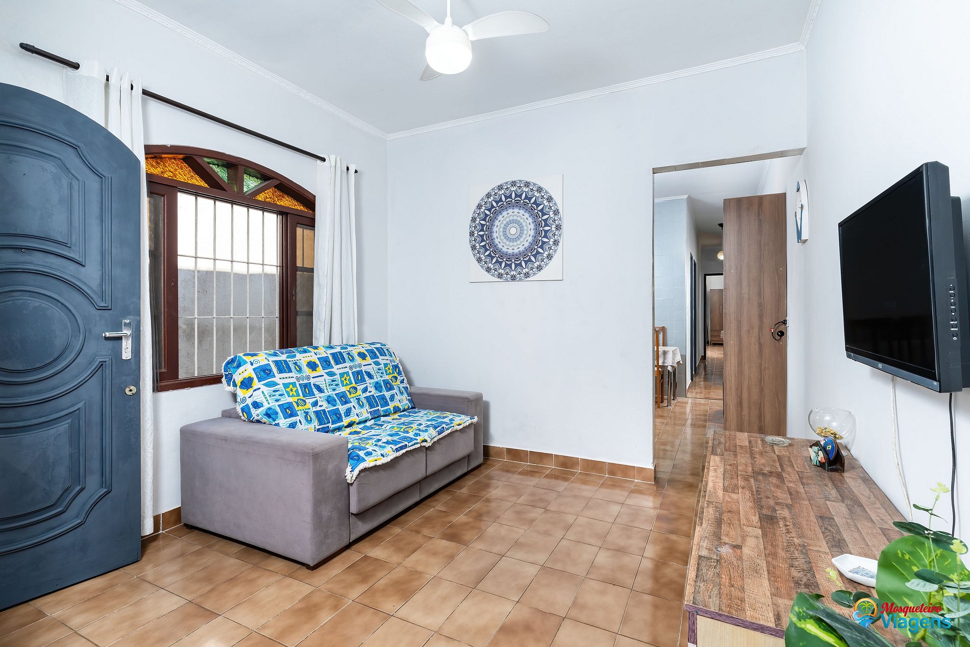 O imóvel oferece 2 dormitórios, sendo 1 suíte, com camas de casal, beliche, cama de solteiro e ventiladores de teto para mais conforto.
