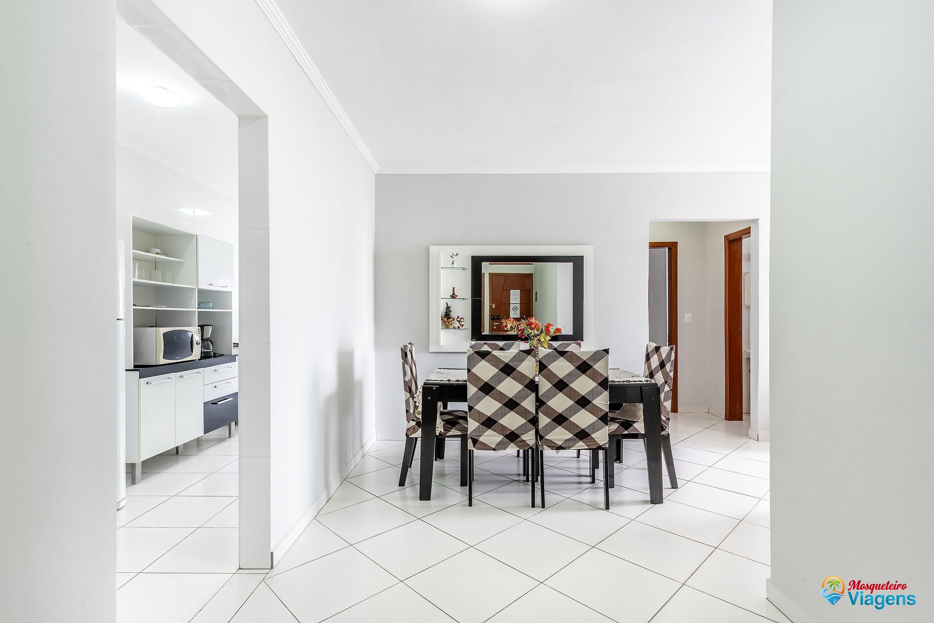 Ambiente espaçoso com 2 dormitórios, sendo 1 suíte, sala de estar e jantar, cozinha equipada (geladeira, fogão, micro-ondas, utensílios) e área de serviço.